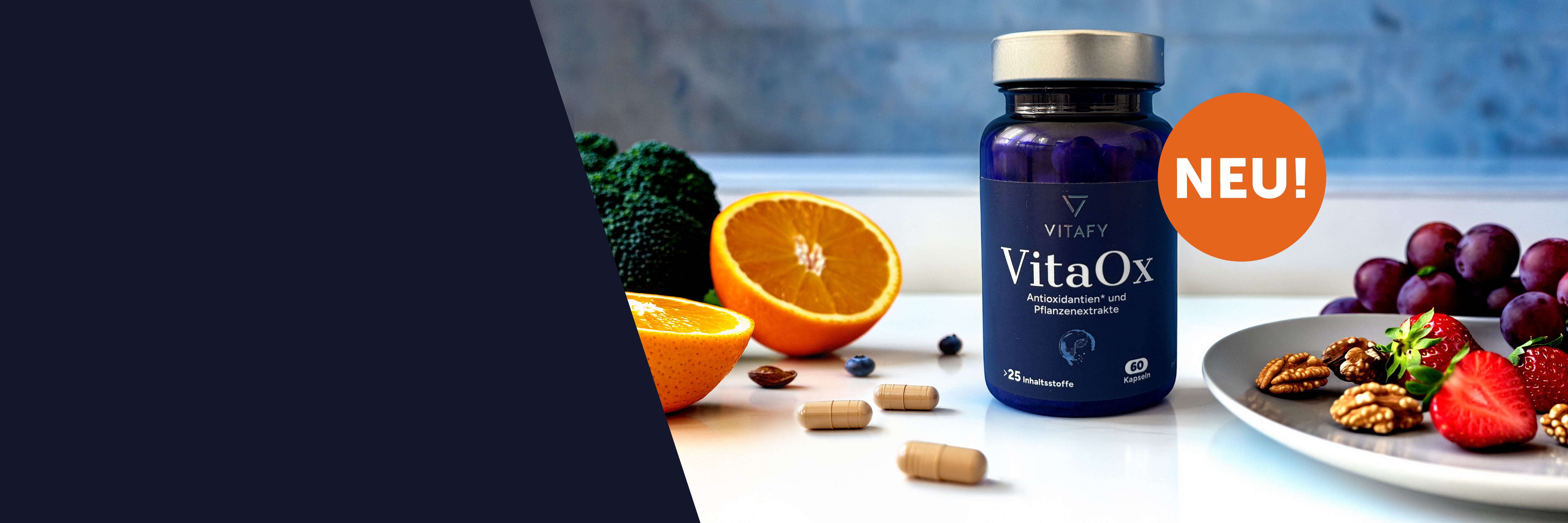 VitaOx von VITAFY vereint über 25 hochwertige Inhaltsstoffe zu einer intelligent abgestimmten Premium-Formel. Die Kombination aus Vitaminen, Mineralstoffen und ausgewählten Pflanzenextrakten unterstützt deinen Körper im Alltag – ideal, wenn du Wert auf eine moderne und ganzheitliche Supplement-Routine legst.